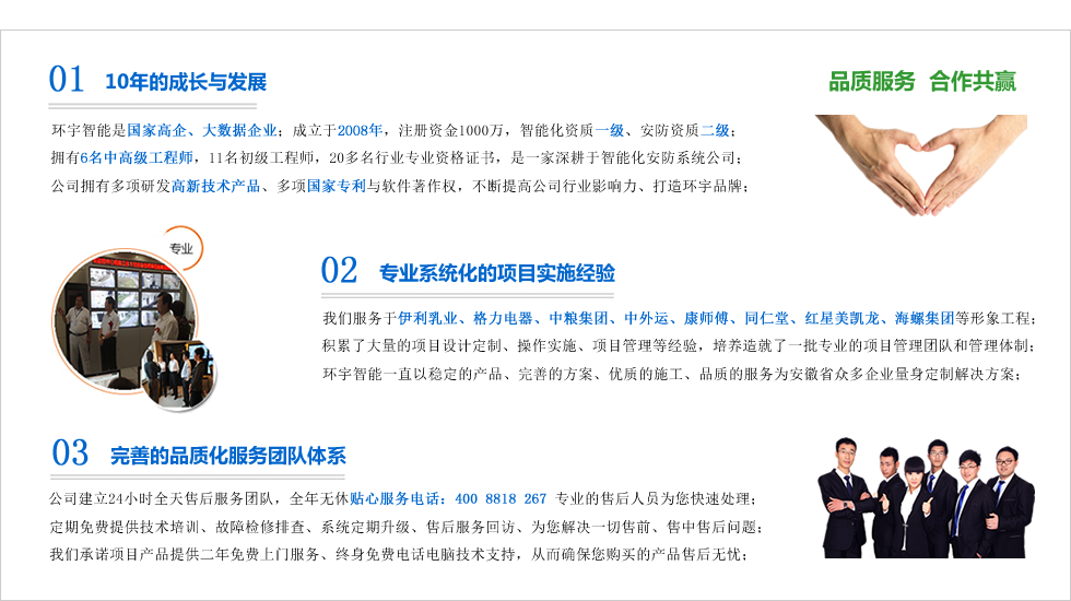 合肥市環宇智能工程有限公司成立于2008年,科創版上市企業,現注冊資金1000整,電子與智能化系統集成資質壹級,安防資質,是“國家高新技術企業”、“合肥市高新技術產品認定企業”、“安徽省安防協會會員單位”、“AAA級信用等級認證企業”、“AAA級重合同守信用企業”、“合肥市創新型企業”、是行業領先的智能化整體解決方案的集成商。